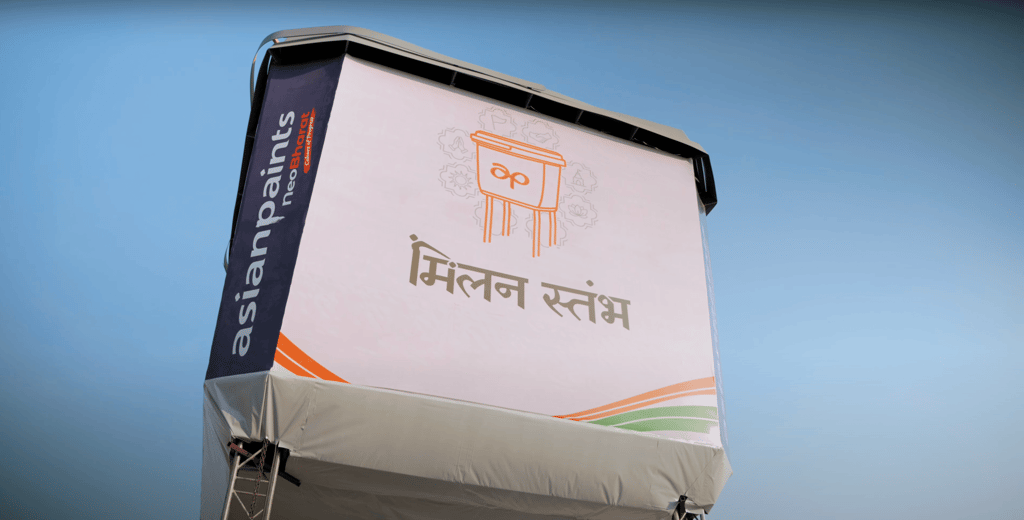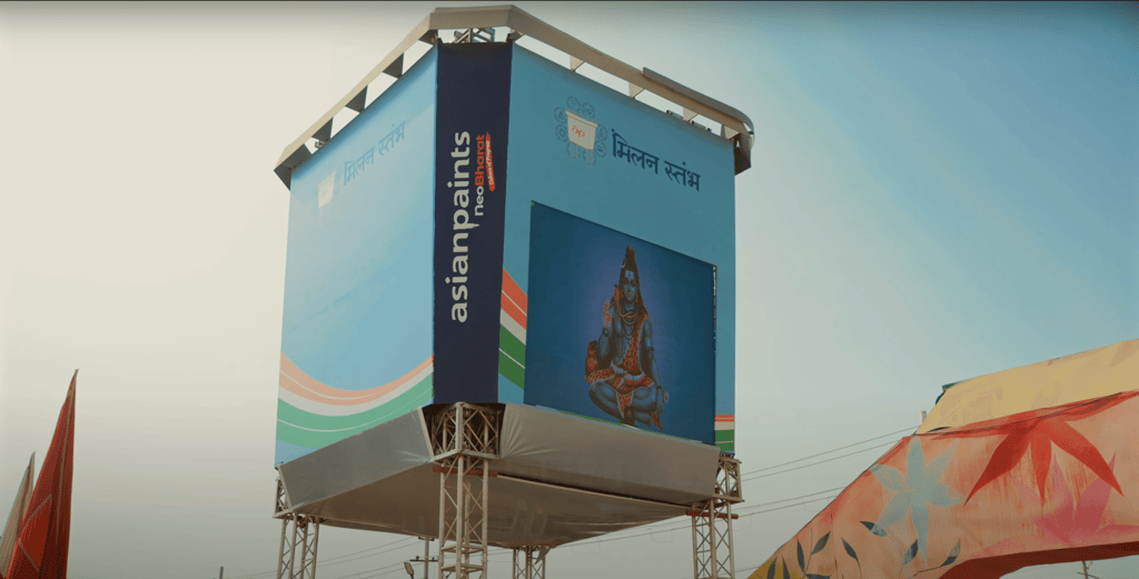 The core idea was to transform the brand’s most iconic asset—its Neo Bharat Latex Paint can—into a 30-foot-tall spiritual beacon. We installed these towering structures at critical junctions in the Kumbh Mela, featuring deity-inspired visuals (Shivji and Hanumanji) to help pilgrims easily identify them in the chaotic sprawl of the event. Each structure was fitted with high-visibility LED displays that showed real-time updates and photographs of missing persons, in partnership with local authorities and Khoya Paya centers.