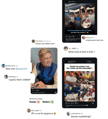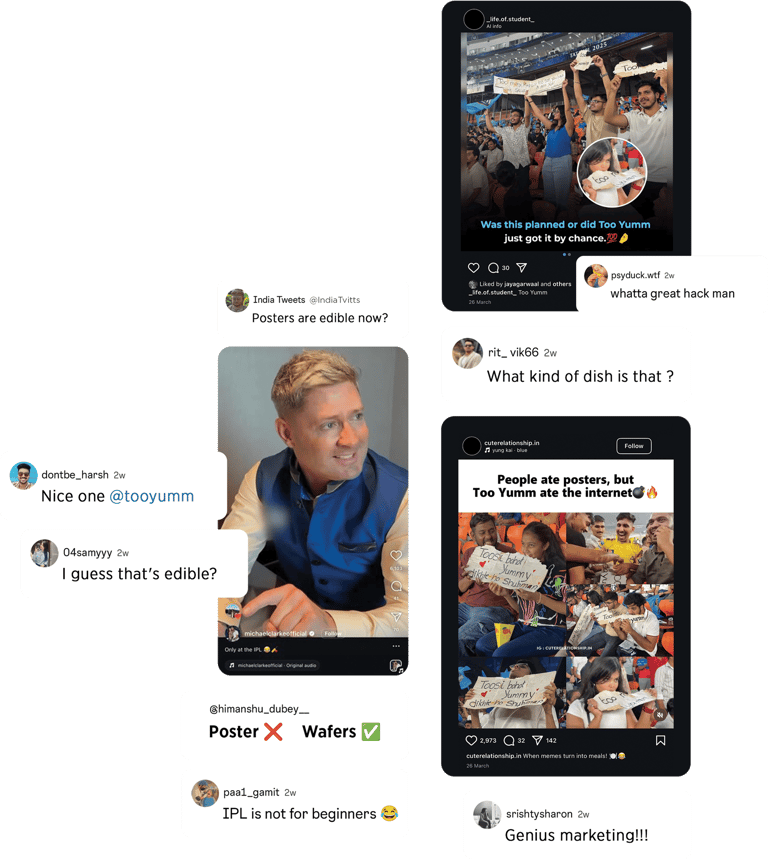 Cracked a never-been-done-before idea for Too Yumm! during the IPL: edible cheer signs that fans could bring into stadiums, eat mid-match, and unknowingly reveal our brand in the process. Took the idea from sketch to reality — personally collaborated with outreach teams, client stakeholders, and Too Yumm!’s factory to explore feasibility.